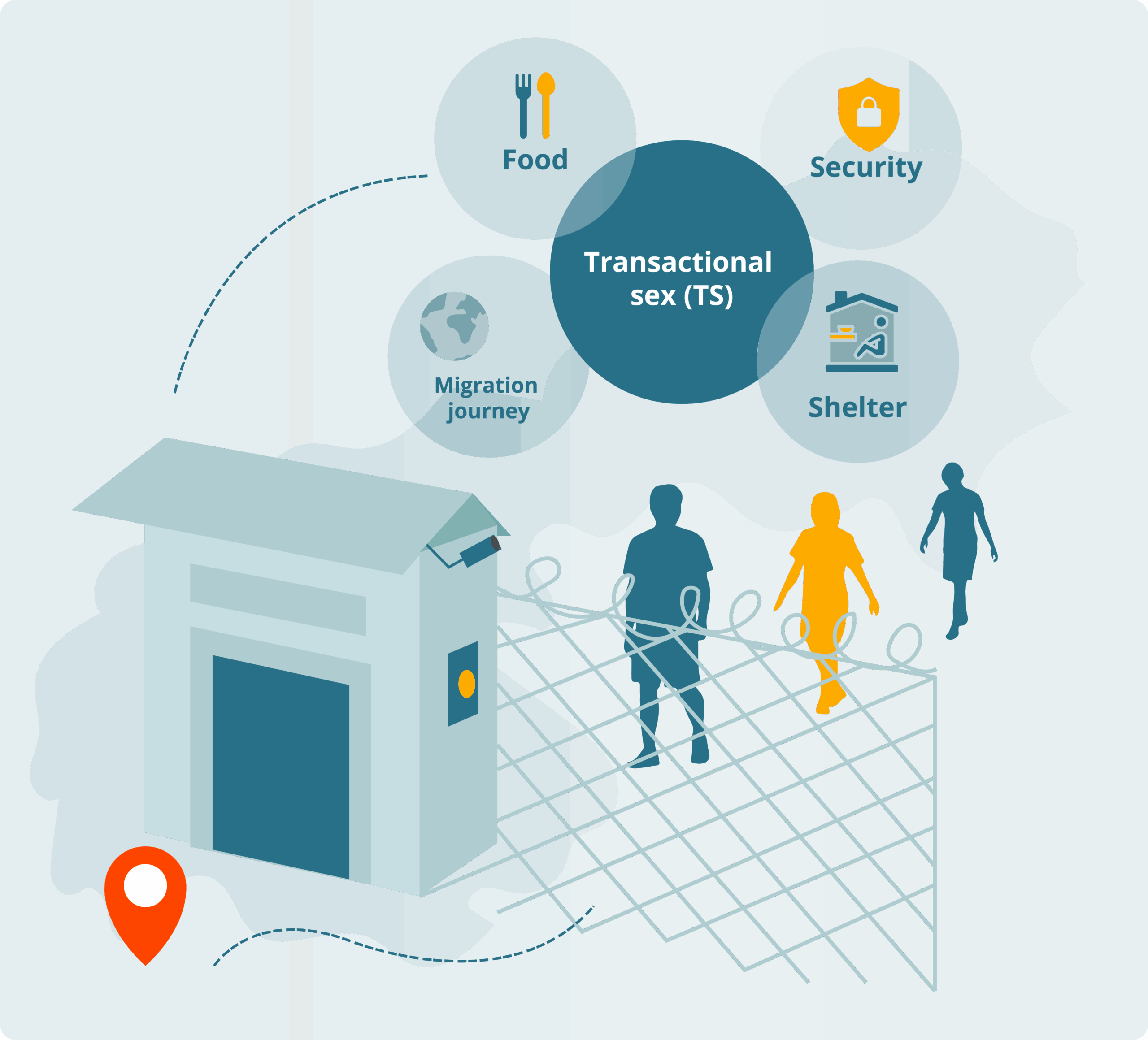 Across all study settings, the report identifies structural conditions that facilitate engagement in transactional sex in forced displacement contexts. These include restrictive legal and migration regimes, exclusion from formal labour markets, inadequate access to basic services and humanitarian assistance, housing insecurity, and persistent economic precarity. These constraints intersect with gendered power relations, discrimination, and stigma — particularly affecting women, men, and people of diverse sexual orientation, gender identity, gender expression and sex characteristics (SOGIESC). Together, these structural drivers shape limited choices and heighten exposure to violence, health risks, and exploitation.